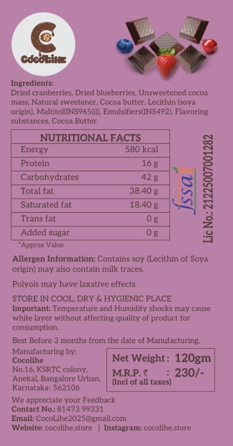 A vibrant fusion of dried cranberries, strawberries and blueberries swirled into dark chocolate — fruity, tangy, and naturally uplifting with every guilt-free bite.